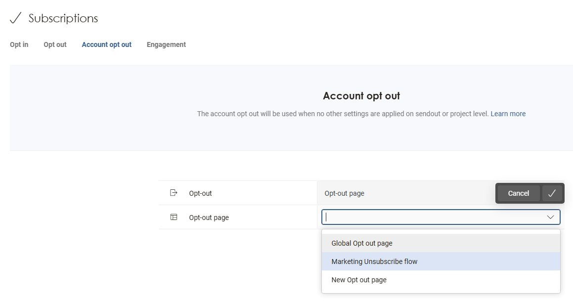 Go to Settings > Projects, select your Project in question - the same in which you built the opt out page, and here, you will be able to select "Opt-out page". Selecting that and applying, will let you select your newly created Opt out page: