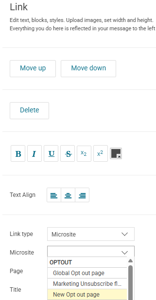Click on your link in your email, and select Microsite under "Link type", then find your new opt out page under Microsite: