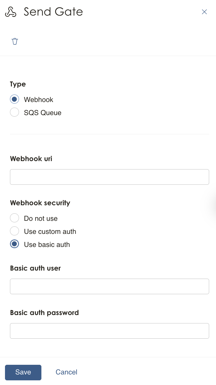 To set up the webhook for you Send gate go to Settings > Webhooks > Send gate