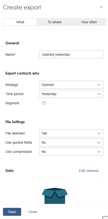 Then select time period, e.g. how many days of data should your exported filed contain. The most common time period is “yesterday”, with the export frequency “every day” (more about frequency below).
