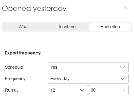 Selecting Yes under Schedule enables you to choose the frequency of the exports. Select No if you instead wish to do a one off export. Then choose when and how often your export should run. We recommend that you match the selected time period you’ve given previously.