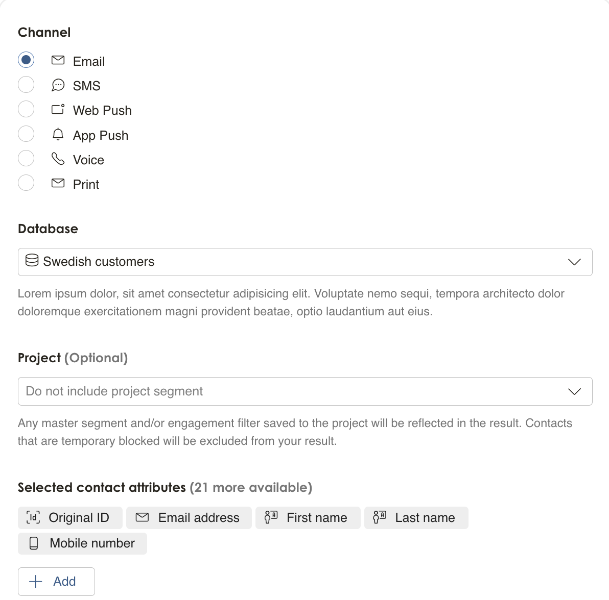 E.g. if you select Email, contacts should have an email address, be subscribed to the email channel and not be bounced. - Select the database you want to run the segment on.