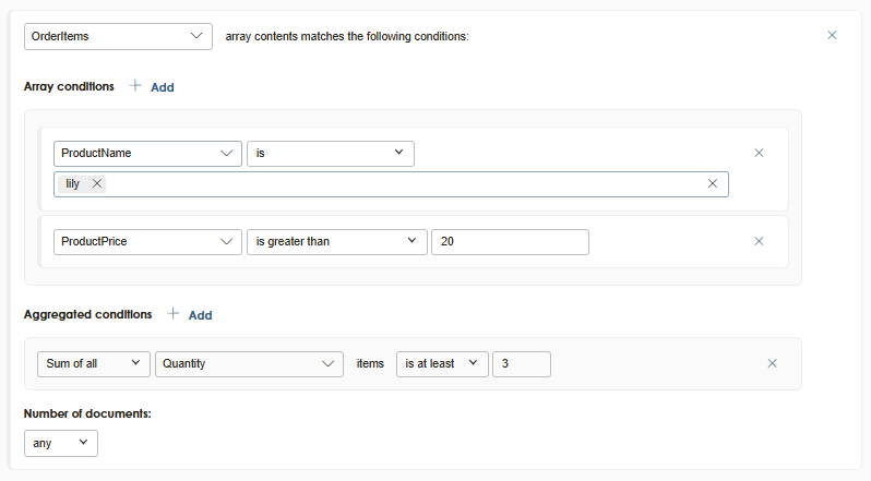In below example matching contacts would need at least one item in the array holding productName equals lily and price is more than 20. Also (all together) the matching item(s) must have at least a quantity of 3.