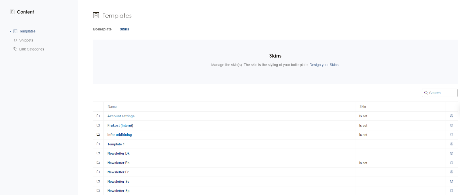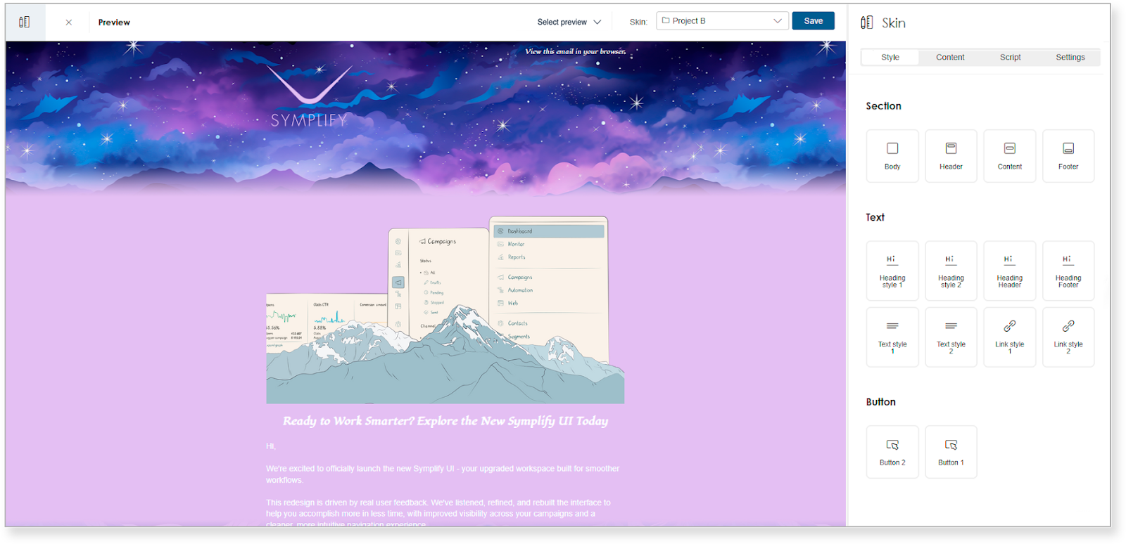 Voici notre nouvel Éditeur de skins, qui facilite la gestion et la mise à jour du contenu et du style par défaut de tous les modèles. Cela simplifie la maintenance et garantit une conception cohérente entre les projets. Les skins sont principalement utilisés pour le style de base, ainsi que pour les informations d'en-tête et de pied de page, mais ils peuvent également être personnalisés pour inclure d'autres éléments dans votre modèle. Les skins facilitent également la mise à jour d'éléments, tels que votre logo, dans tous les envois à la fois. Toute modification apportée dans l'éditeur est automatiquement répercutée dans tous les brouillons d'e-mails créés à partir du modèle, ainsi que dans tous les e-mails actuellement actifs dans les parcours.