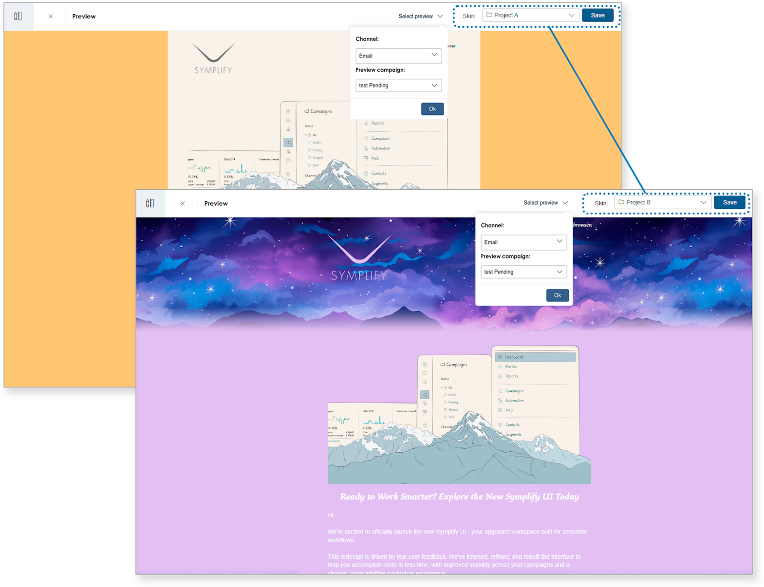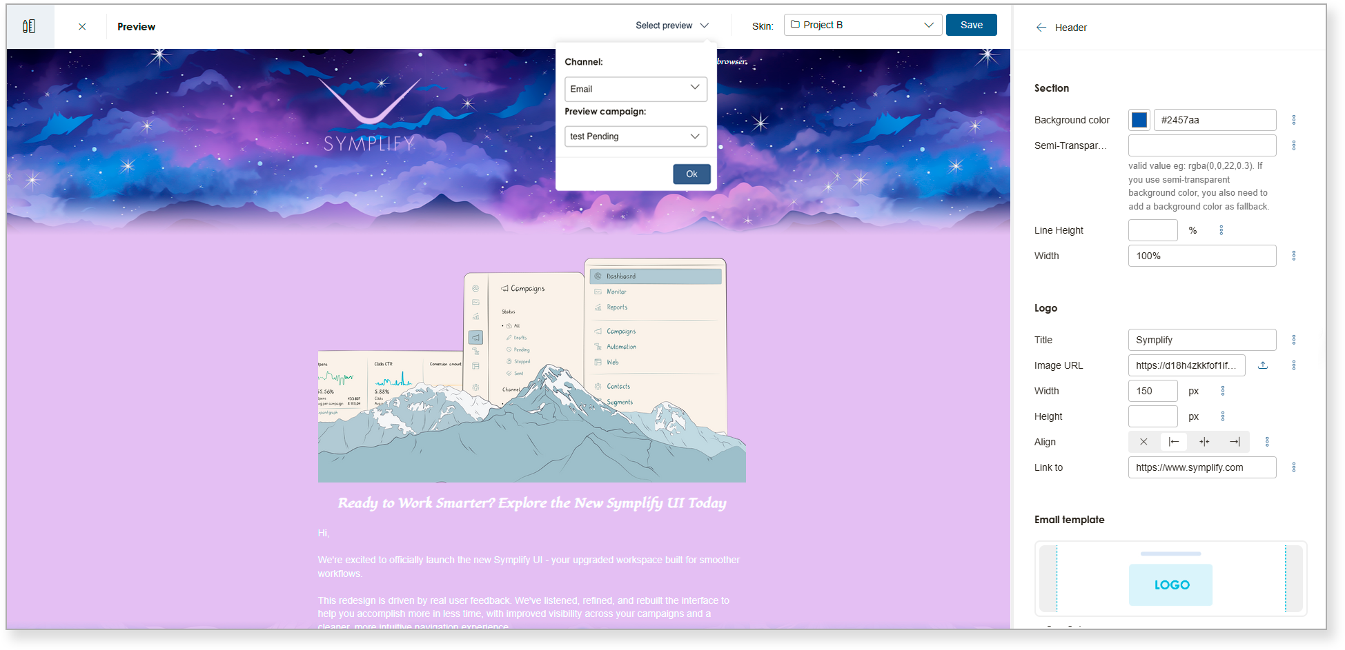 En haut de l'éditeur, vous pouvez choisir ce que vous souhaitez prévisualiser. Le canal sélectionné détermine les campagnes disponibles en prévisualisation. N'oubliez pas que chaque campagne est créée à partir d'un modèle spécifique, de sorte que le contenu et la mise en page peuvent varier en fonction de cette configuration. Vous pouvez également passer d'un skin à l'autre pour voir à quoi ressemblera une campagne avec un style différent. Cela vous permet de vous assurer que votre design et votre image de marque sont cohérents sur tous les canaux.