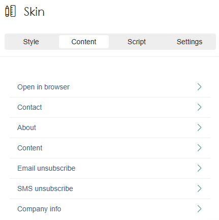 Dans l'onglet Contenu, vous pouvez modifier les textes par défaut de votre modèle (boilerplate), y compris les en-têtes, les pieds de page, les messages de désabonnement aux e-mails/SMS et d'autres sections.