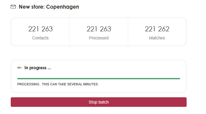 Pour une campagne de courriels en attente, vous verrez tout ce qui précède, ainsi qu'une barre d'état et l'option permettant d'arrêter le lot.