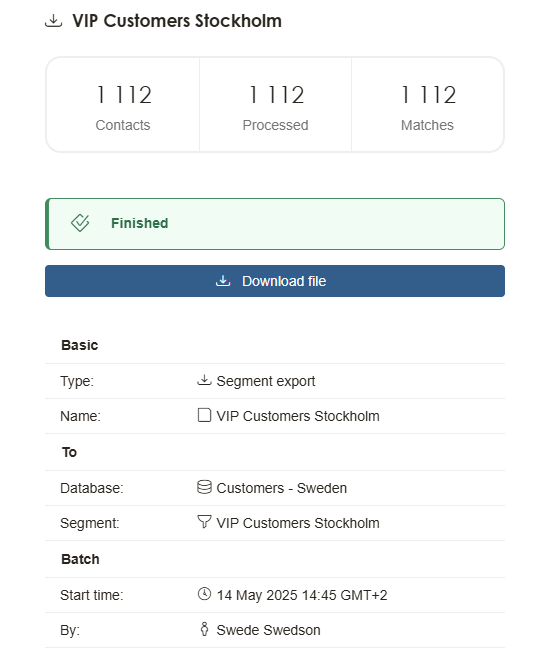 Voici un autre exemple, mais cette fois-ci pour l'exportation d'un segment. Il affichera le nom du segment, la base de données sur laquelle le segment a été exécuté et l'heure de début. À partir de là, vous pouvez également télécharger le segment.